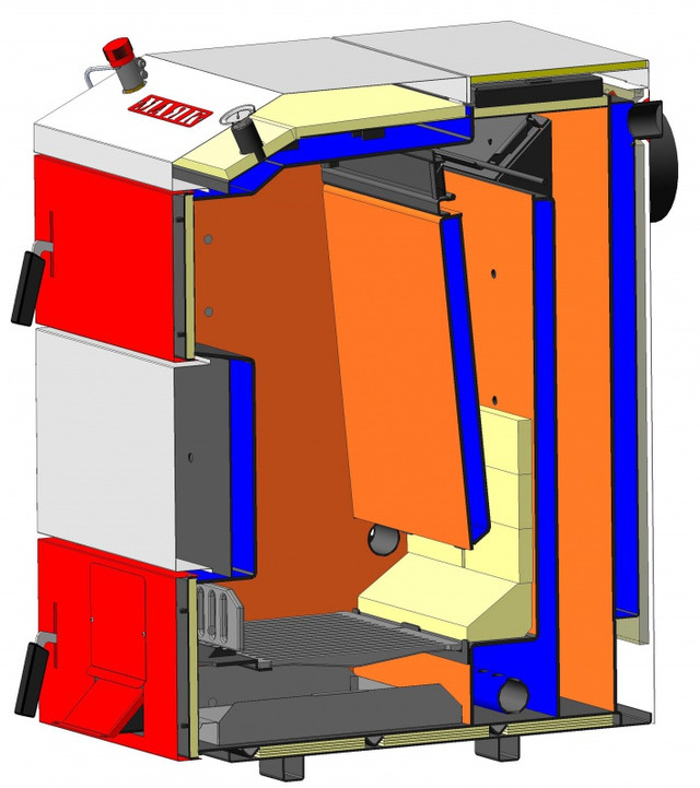 Триходова конструкція теплообмінника забезпечує максимально ефективне та тривале спалювання сухого твердого палива за високих температур у зоні керамічних плит із низьким коефіцієнтом розведення повітрям із допалюванням піролізних газів. Водночас, на відміну від піролізних аналогів, ця серія котлів ефективно працює автономно, без під'єднання до електромережі. Залежно від потреби або особливостей використовуваного палива, котел може працювати в режимі нижнього або верхнього горіння, перемикання режиму відбувається через встановлення у відповідне положення заслінок у димових каналах.