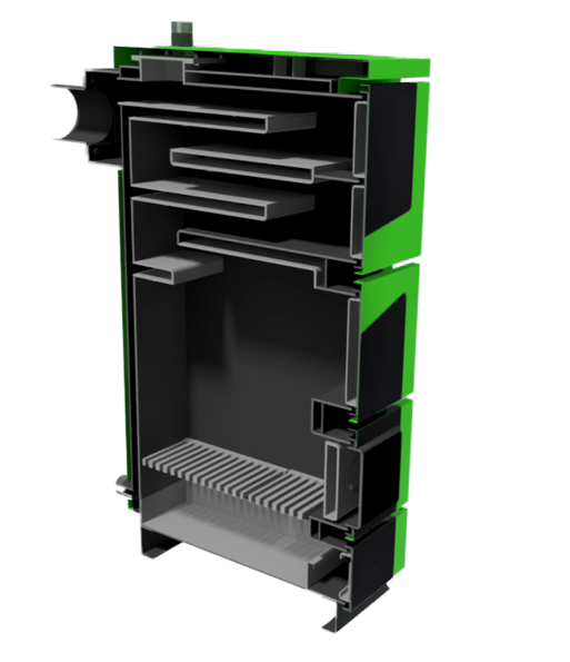 виконаний з 6 міліметрів сталь і має унікальні відмінності та додаткові функції, які впливають на кращий ККД і витрату палива. Модель котла ми відносимо до преміум-сегменту. Він працює не тільки на твердому паливі, а й підтримує встановлення пелетного пальника. Розповімо докладніше про унікальну конструкцію з 4 відділень та їхню функцію.