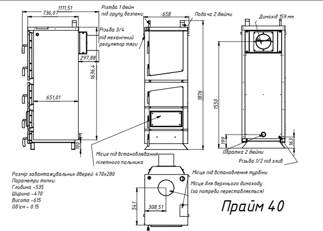 - Патрубки для регулятора тяги - встановлення механічного регулятора з обох сторін котла.