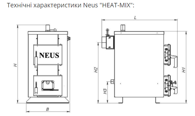 Збірно-зварна конструкція котла Neus HEAT-MIX зі сталевим теплообмінником передбачає наявність корпусу і камери згоряння. На верхній поверхні корпусу під декоративною кришкою закріплена чавунна плита. Подвійні стінки корпусу розділені водними перегородками, а із зовнішнього боку виробник застосував захисний декоративний шар (захист від корозії та інших факторів впливу ззовні).