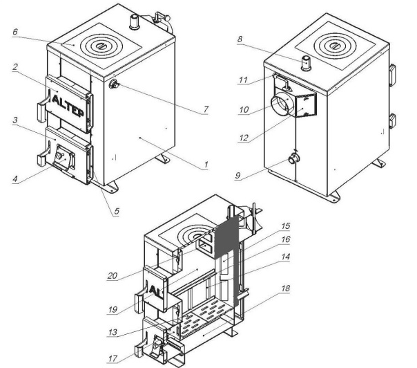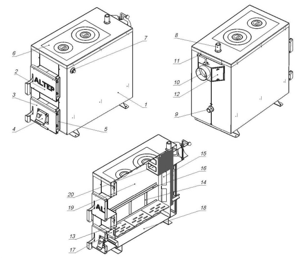 У представленому котлі з плитою серії Neus HEAT-MIX виробник передбачив можливість змінювати робочі режими обладнання з урахуванням зима/літо. Для цього в котлі встановлено опорні кутники на різній висоті. Нижнє положення для "зимового режиму" і верхнє для "літнього режиму" (рис. пункт 16). Щоб змінити положення, потрібно колосникову решітку переставити або в нижнє положення, або у верхнє. При цьому змінюється робочий об'єм камери згоряння.