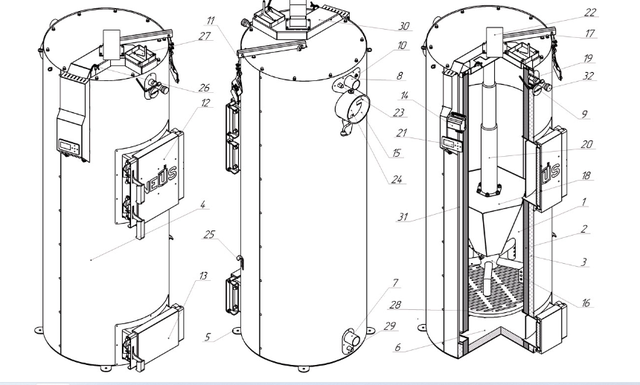 Основні елементи котла наведені на малюнку нижче. Котел складається з наступних основних частин: Камери згоряння (поз. 1), труби подачі повітря (поз. 20), розподільника повітря (поз. 16), рухомої камери підігріву повітря (поз. 18) виконаної у виді зрізаної шестикутної піраміди захисного кожуха (поз. 4), теплоізоляційної оболонки (поз. 3). Камера згоряння (поз. 1) виконана у формі циліндра, що має подвійну стінку. Порожнина між внутрішнім і зовнішнім циліндром заповнена водою (поз. 2). Камера підігріву повітря (поз. 18) може вільно рухатися вверх вниз котла вздовж труби подачі повітря (поз. 20), яка закріплена до верхньої частини котла. У нижній частині камери підігріву повітря (поз. 18) прикріплено розподільник повітря (поз. 16), що розподіляє, подаючи вже підігріте повітря до осередку згоряння палива. Розподільник повітря (поз. 16) опирається на верхню частину завантажених дров і опускається вниз котла разом з палаючим паливом. УВАГА! Розподільник повітря (поз. 16) витратним матеріалом, і гарантія на нього не розповсюджується. В залежності від свого виду паливо для процесу спалення завантажується на дно котла, виконане з жароміцного бетону (поз. 6) або на чавунний колосник (поз. 28) крізь завантажувальні дверцята (поз. 12). Згоряння палива в топці відбувається за участю повітря, яке постачається по каналу подачі повітря (поз. 30) припливним вентилятором (поз. 23) чи природньою тягою через клапан (поз. 27) Кількість повітря, необхідного для процесу згоряння, регулюється або автоматично блоком автоматики управління (поз. 14), або механічним регулятором(поз. 32). При спалюванні вугілля частина повітря подається по вертикальному каналу подачі повітря (поз. 31) під колосникову решітку (поз. 28). Регулювання кількості повітря під колосникову решітку відбувається за допомого заслінки (поз. 26) Підведення і відведення теплоносія здійснюється відповідно через патрубки зворотної мережної води (поз. 7) і прямої мережної води (поз. 8). Топочні гази виходять у димохід крізь боров (поз. 15), розташований у задній частині котла. У верхній частині корпуса котла розташований штуцер для встановлення запобіжного клапана котла (поз. 23). Ревізійний дверцята (поз. 13), що розташовані на передній стінці котла, необхідні для періодичного чищення нижньої частини котла від золи.