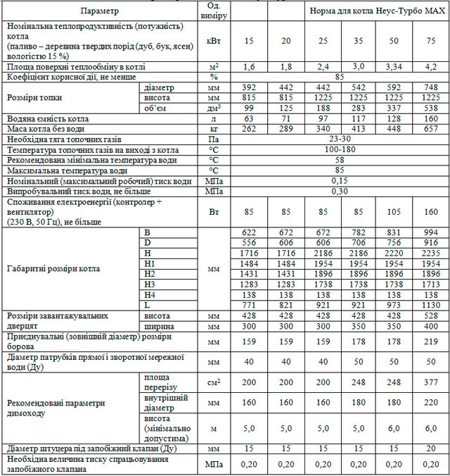 Котел Неус Турбо Max - оновлена версія моделі Неус Турбо, в якій суттєво удосконалена конструкція і збільшений термін експлуатації котла з 10 до 15 років. Варіанти потужності котлів Neus Турбо: 15 кВт, 20 кВт, 35 кВт, 50, 75 кВт. Котли Neus Turbo призначені для опалення побутових, виробничих та інших приміщень, в яких обладнана система центрального опалення, для підготовки і подачі тепла на технологічні потреби з використанням в якості палива дров, деревних відходів, тирсових і торф'яних брикетів, кускового торфу. Показник тривалості згоряння разового завантаження палива безпосередньо залежить від виду і якості палива і теплових втрат об'єкта опалюється. Експлуатація котла можлива тільки в режимі ручного подавання твердого палива. Особливості котлів Neus Турбо Max: Універсальний котел, який має 2 режими роботи - на дровах та на вугіллі. Для використання вугілля котел переводиться в режим подачі повітря під колосникову решітку. Вугілля горить на чавунних колосниках; Котел укомплектований ефективним розподільником повітря з жаростійкої нержавіючою сталі; Котел має камеру попереднього нагріву повітря, з якої вже тепле повітря подається через розподільник повітря в камеру згорання. Таким чином забезпечується більш ефективне згорання палива і збільшується в цілому ККД котла; Верхні завантажувальні дверцята мають достатньо велику площу, що дає можливість зручно і дуже компактно завантажити топку котла; Товщина стали теплообмінника 5 мм; Дно оброблено жаростійким бетоном. Це дуже важливо так як на дно виявляється сильний тепловий удар; Горіння котла на одній загрузці складає від 24 годин на дровах, та від 48 годин на вугіллі; Котел укомплектований якісної автоматикою; Котел має товстий шар ізоляції - 5 см; Гарантія на котел - 5 років.